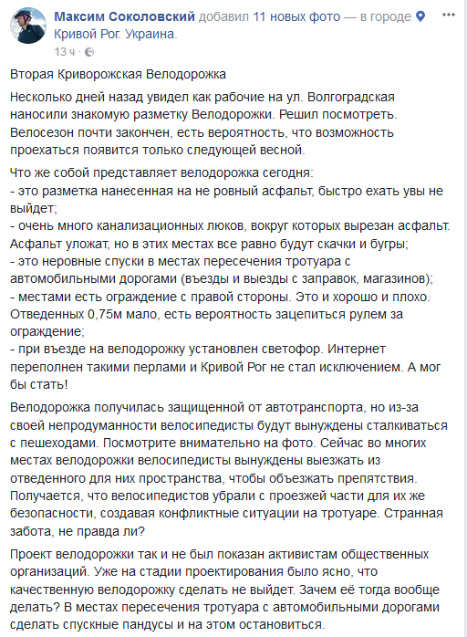 Член совета общественной организации Ukraine Bike Family, велоактивист и член команды Велогена, Максим Соколовский детально проанализировал результаты распиаренной новой велодоржки по улице Волгоградской. И пришел к неутешительным выводам: