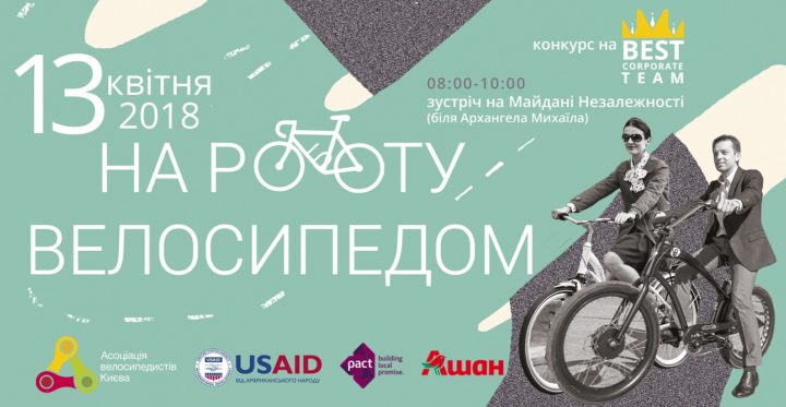 У весняний день “Велосипедом на роботу” заїхати перед роботою на Майдан Незалежності можна поодинці, разом з іншими учасниками зі свого району (мапа збору колон) або разом з колегами у складі корпоративної колони. На Майдані буде конкурс Best Corporate Team, в якому переможе найчисленніша корпоративна велоколона, і конкурс на найкращий діловий лук серед усіх учасників та учасниць заходу. Для участі в конкурсах потрібно зареєструватись: https://goo.gl/2Xf7VM