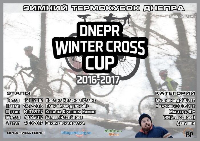 Украина, Днепровская, ДнепропетровскЗимний термокубок DNEPR WINTER CROSS CUP 2016 (в дальнейшем Зимний Кубок или Кубок) проводится с целью борьбы с зимним унынием, зимним застоем и зимней ленью, для выяснения сильнейшего зимнего велогона Днепропетровска в зимний период 2016-2017 годов.